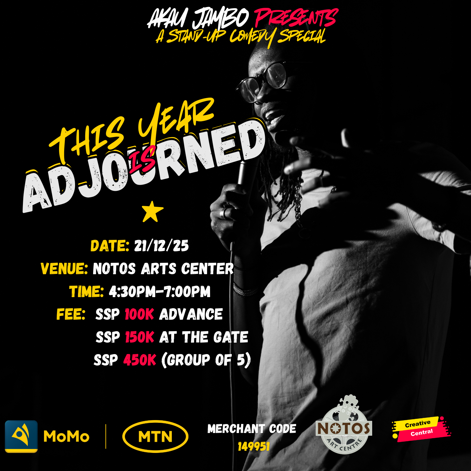 Get ready to laugh your way into the holiday season as the hilarious Akau Jambo takes the stage for a one-night-only stand-up comedy special, "This Year Adjourned." Join us for an evening of unforget...